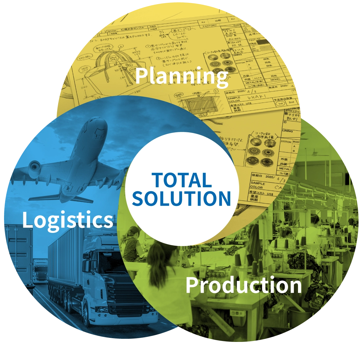 私たちは、アパレル業界におけるトータルソリューションパートナーとして、企画から国内及び海外生産、検品、国内物流に至るまで、ワンストップでサービスを提供しています。